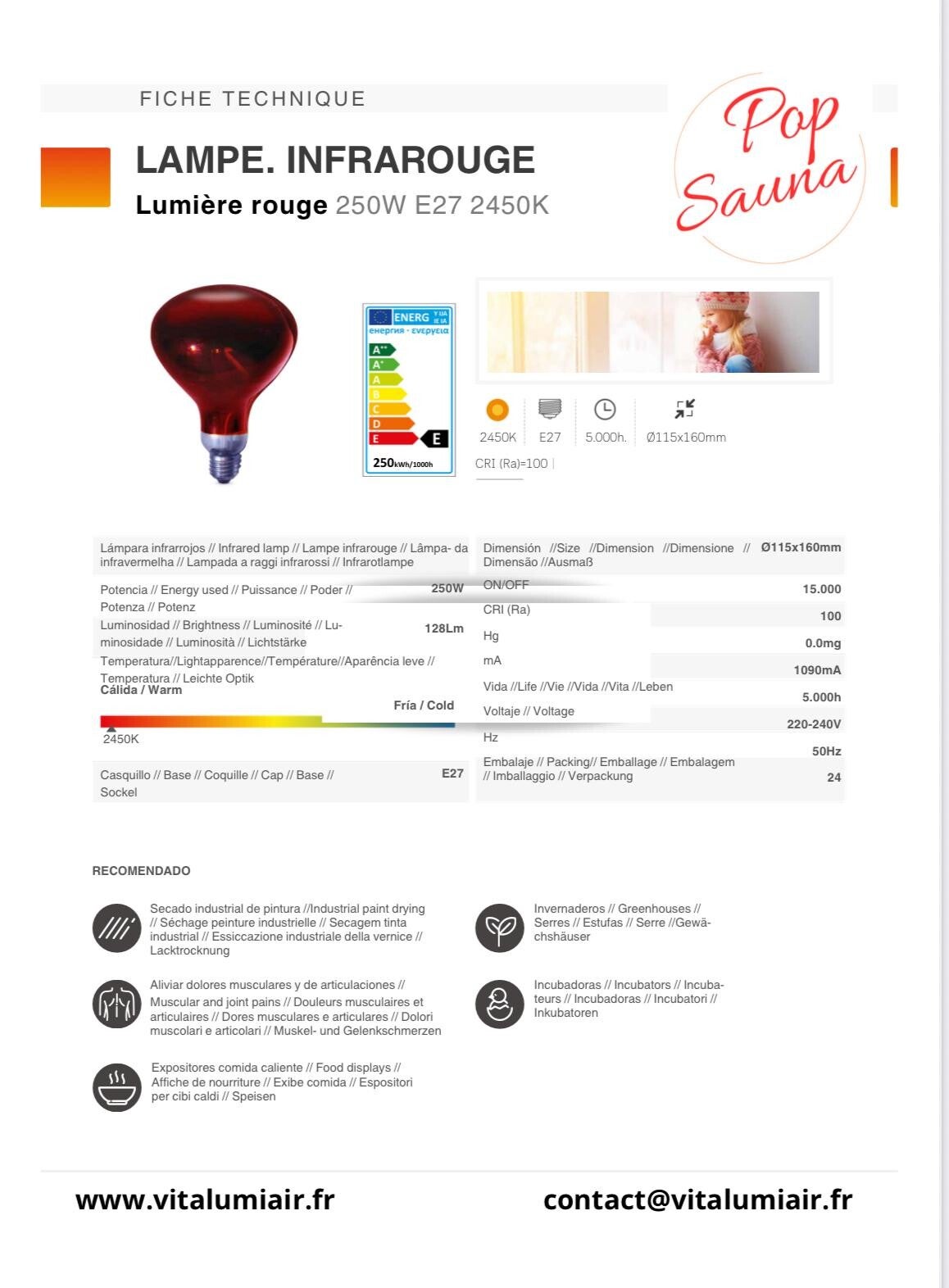 Notre ampoule infrarouge est une ampoule à incandescence haut de gamme de 250W - 220/240V - 50Hz - 1090ma, cette ampoule est une source lumineuse proche infrarouge NIR/IR-A qui n'émet aucun rayonnement infrarouge lointain. Luminosité 128Lm. Notre ampoule infrarouge a été conçue pour fournir un niveau d'infrarouge intense dans un format simple et facile à utiliser, elle produit une chaleur agréable et relaxante. Les ampoules infrarouge sont garanties sans mercure toxique, sans Téflon ni vapeurs fluorées. Toutes les ampoules sont conformes aux directives européennes CE exigeant l'absence de substances toxiques. Elle est conçue pour s'adapter aux douilles standard E27. Chaque ampoule est inspectée, garantie et certifiée conforme. Ce produit n'est pas testé sur les animaux. La durée de vie moyenne d'une ampoule est de 5000 heures en utilisation normale. Chaque ampoule est garantie 30 jours.